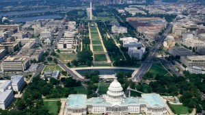 An aerial view of Washington, D.C., focusing on the United States Capitol.