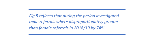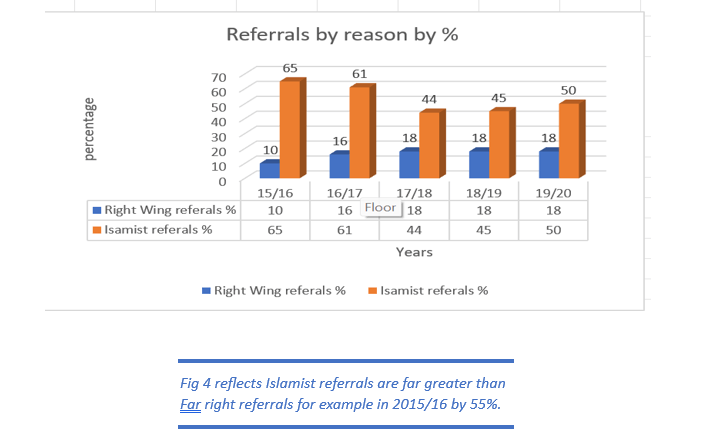 These viewpoints are starkly borne out by data in the graphs (see Fig 4, Fig 5, Fig 11, and Fig 12) which clearly reflect Muslim boys and young men are being disproportionately referred by significantly larger levels than other groups.