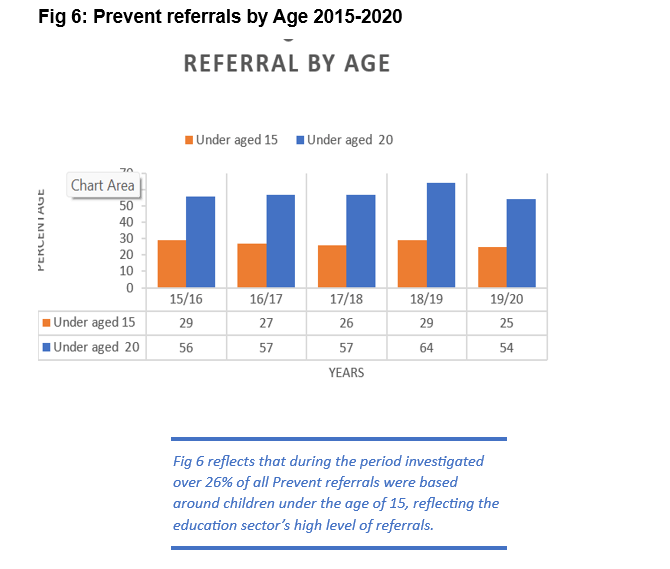 With the education sector creating more referrals than any other sector the BME consultation group could explore the reasoning behind the alarming statistic that young Muslim boys are the highest proportion being referred, with the average age of referrals from all groups being just fourteen during the period investigated. However, the data reflects that within this average range of educational referrals, 26% of students were under the age of fifteen.