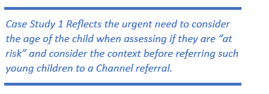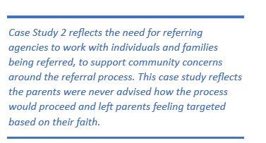 This case study reflects the flawed nature of the referral system, the transcripts of the referral reflect the conversation between the staff and the child was around an on-line game for ownership of an island using a range of weapons. The parents of the child felt “if the boy was white this referral would not have been actioned” this is a prime example of the mistrust Prevent creates in Muslim families and communities.