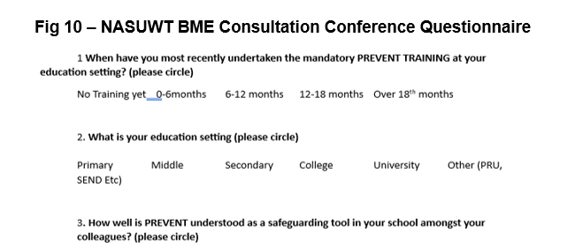 As this is a dedicated space for BME teachers my delivery of the workshop would not appropriate in the first instance but an open forum, safe space where trade union members could discuss their own lived experiences would be invaluable to support any recommendations the trade union might recommend at later point, to support this, I would use a questionnaire I have created (Fig 10) to sample BME teachers’ opinions around Prevent.